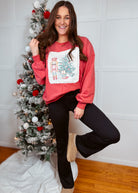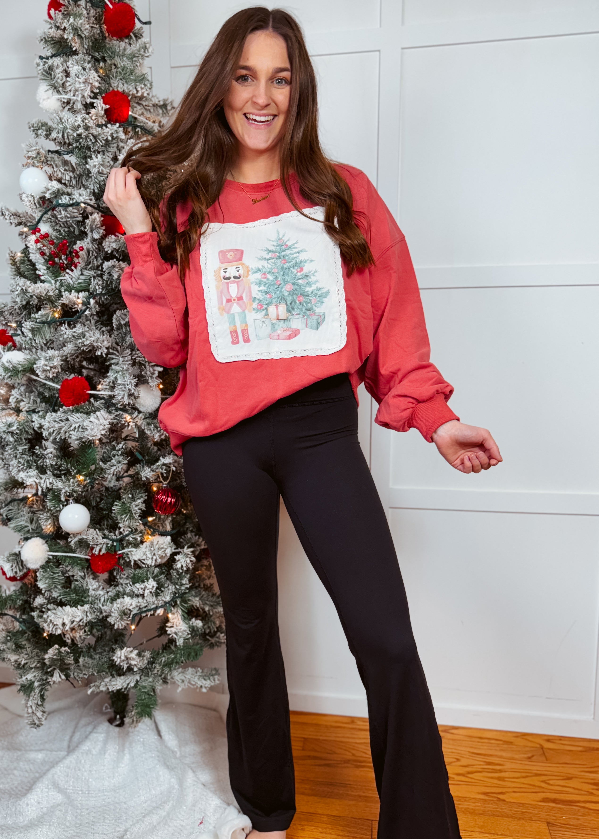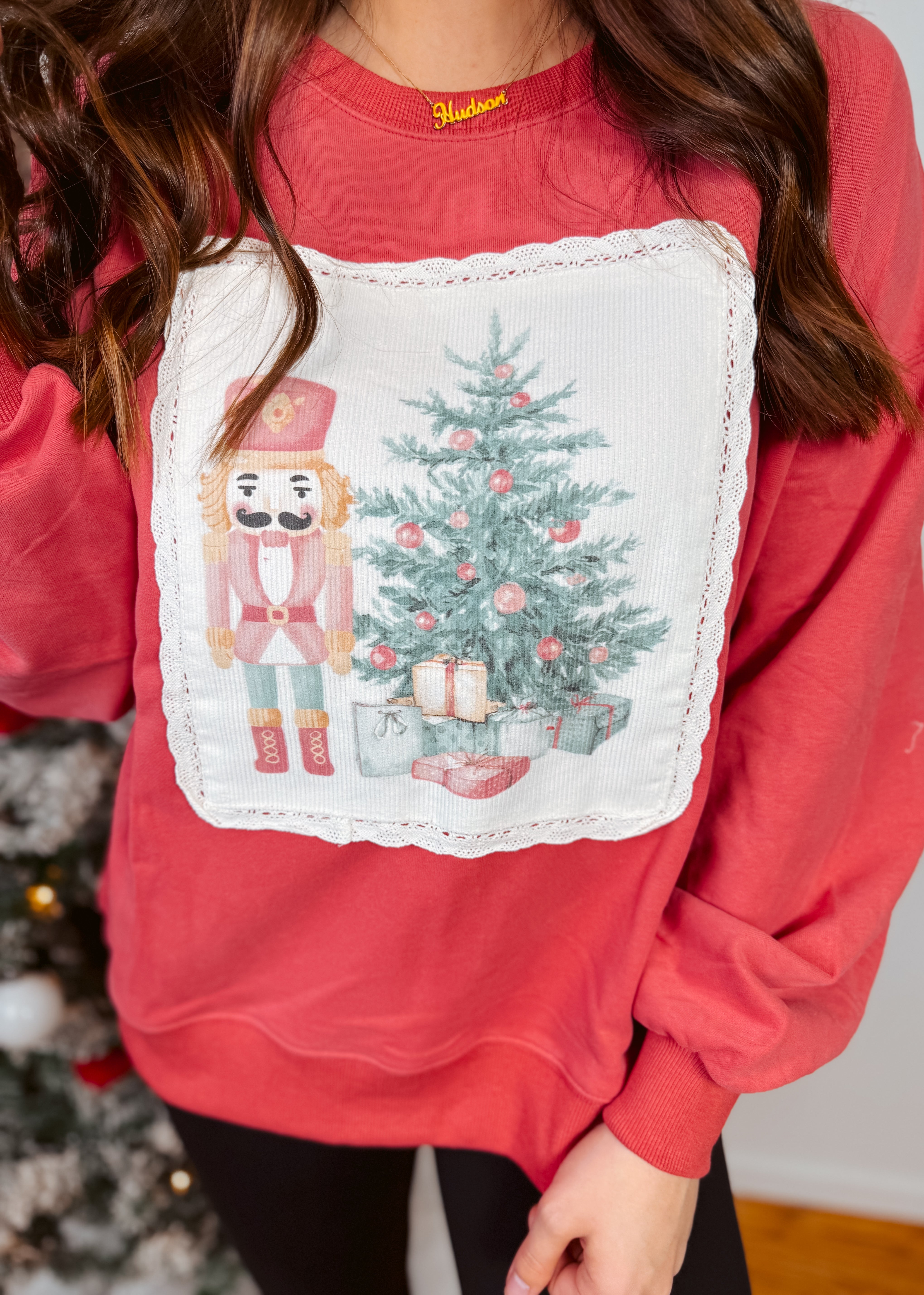 Add a touch of holiday charm to your wardrobe with this Christmas red sweatshirt featuring a printed patch of a nutcracker and Christmas tree. The scallop lace detailing adds a sweet, feminine finish that makes this piece stand out from the usual holiday graphic. Soft, comfy, and easy to style, it’s perfect for Christmas parties, festive outings, or cozy nights in watching holiday movies.