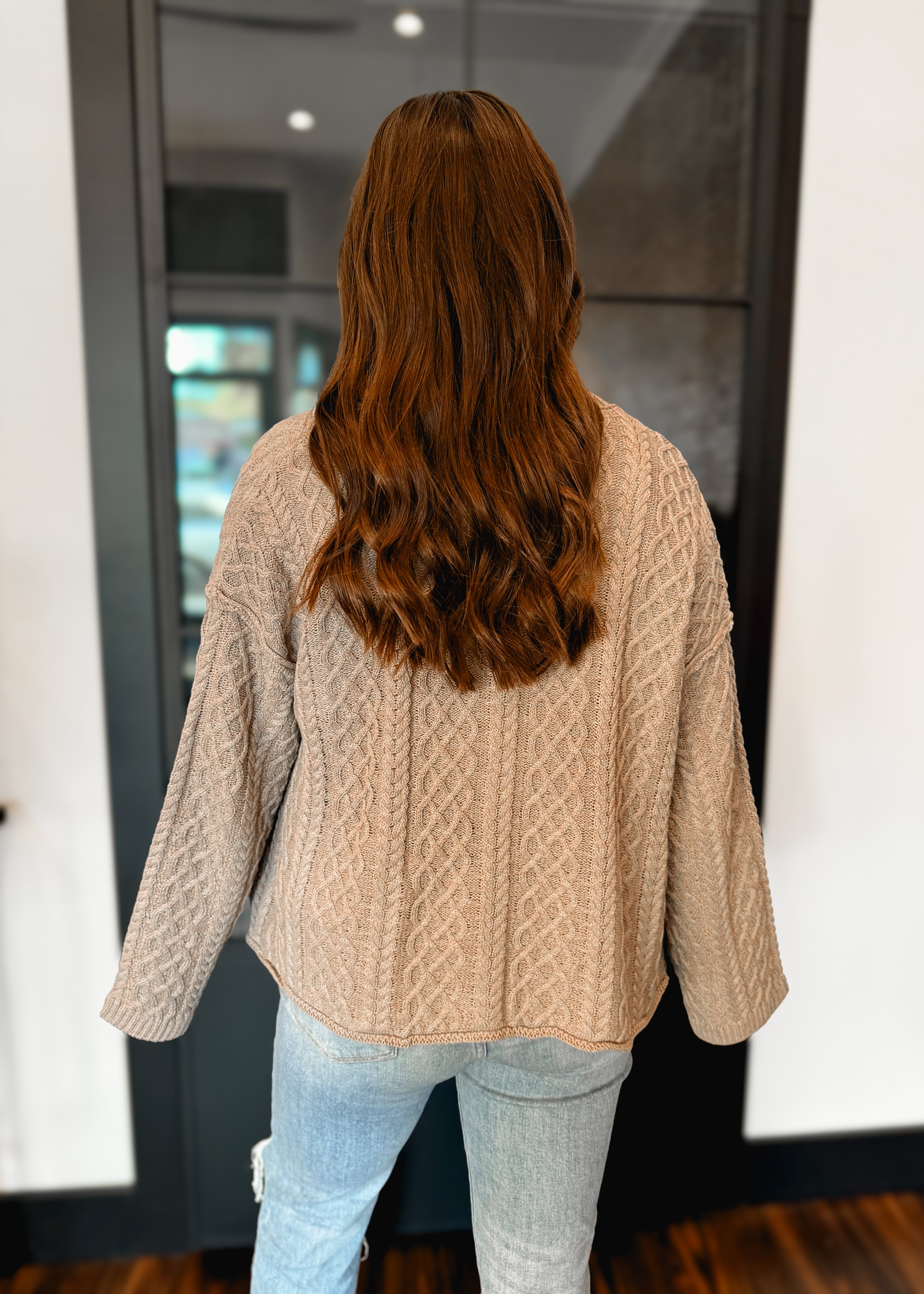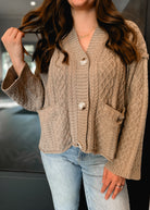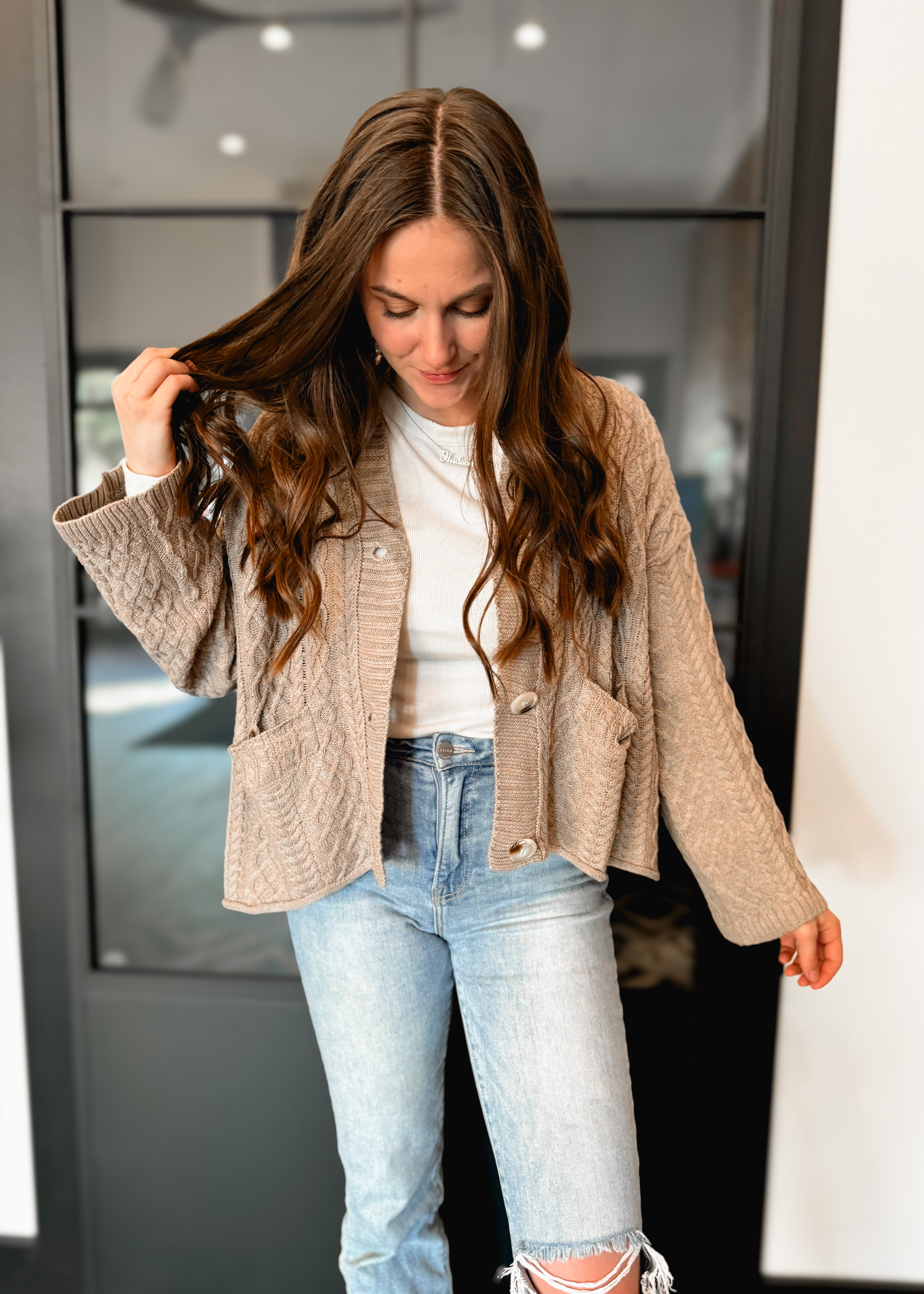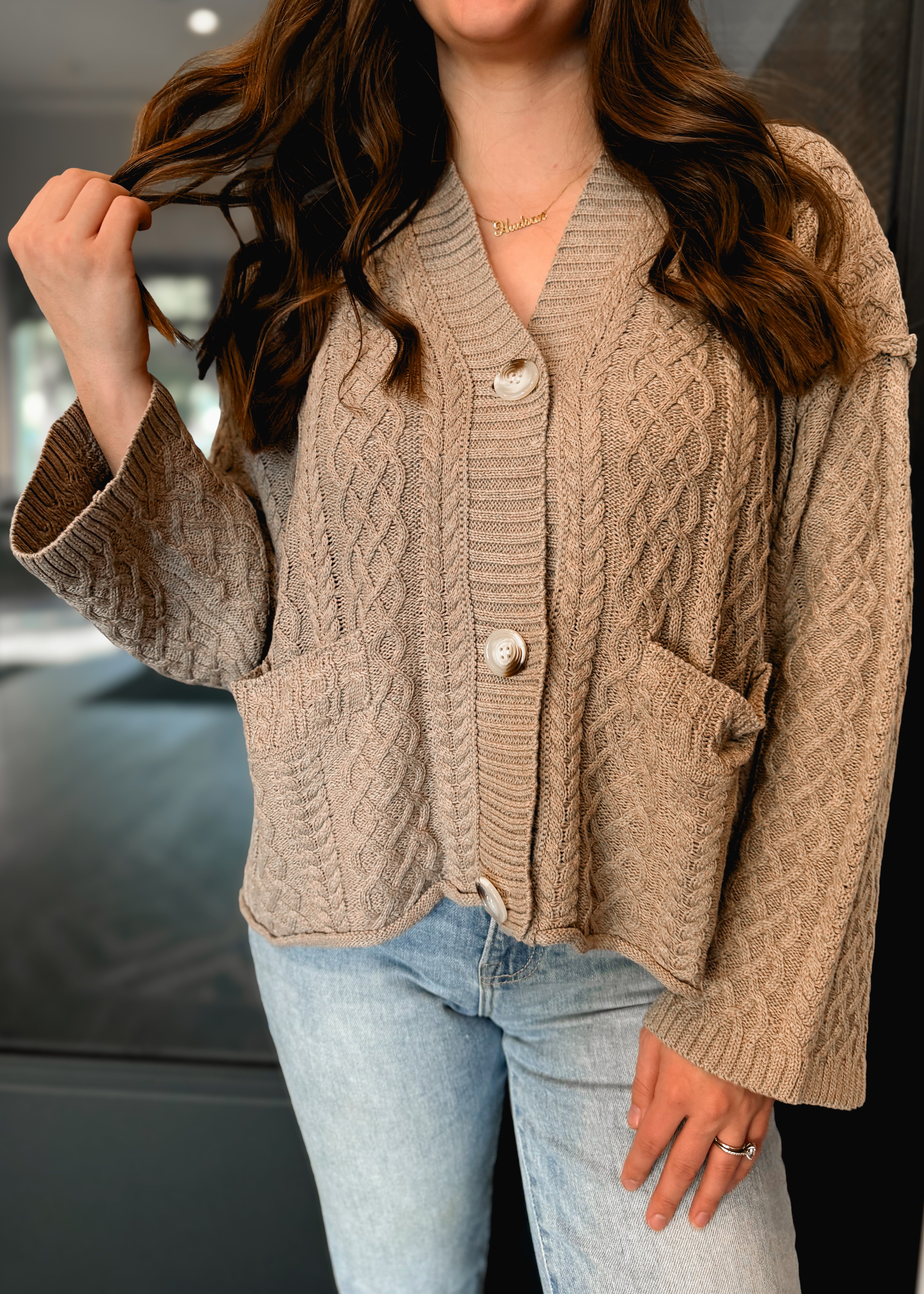 Stay cozy and effortlessly stylish with the Katie Latte Cable Knit Cardigan. Crafted in a soft, warm knit, this cardigan features a timeless cable knit texture and a beautiful latte hue that complements any outfit. Its relaxed fit and open-front design make it perfect for layering over everything from casual tees to flowy dresses.