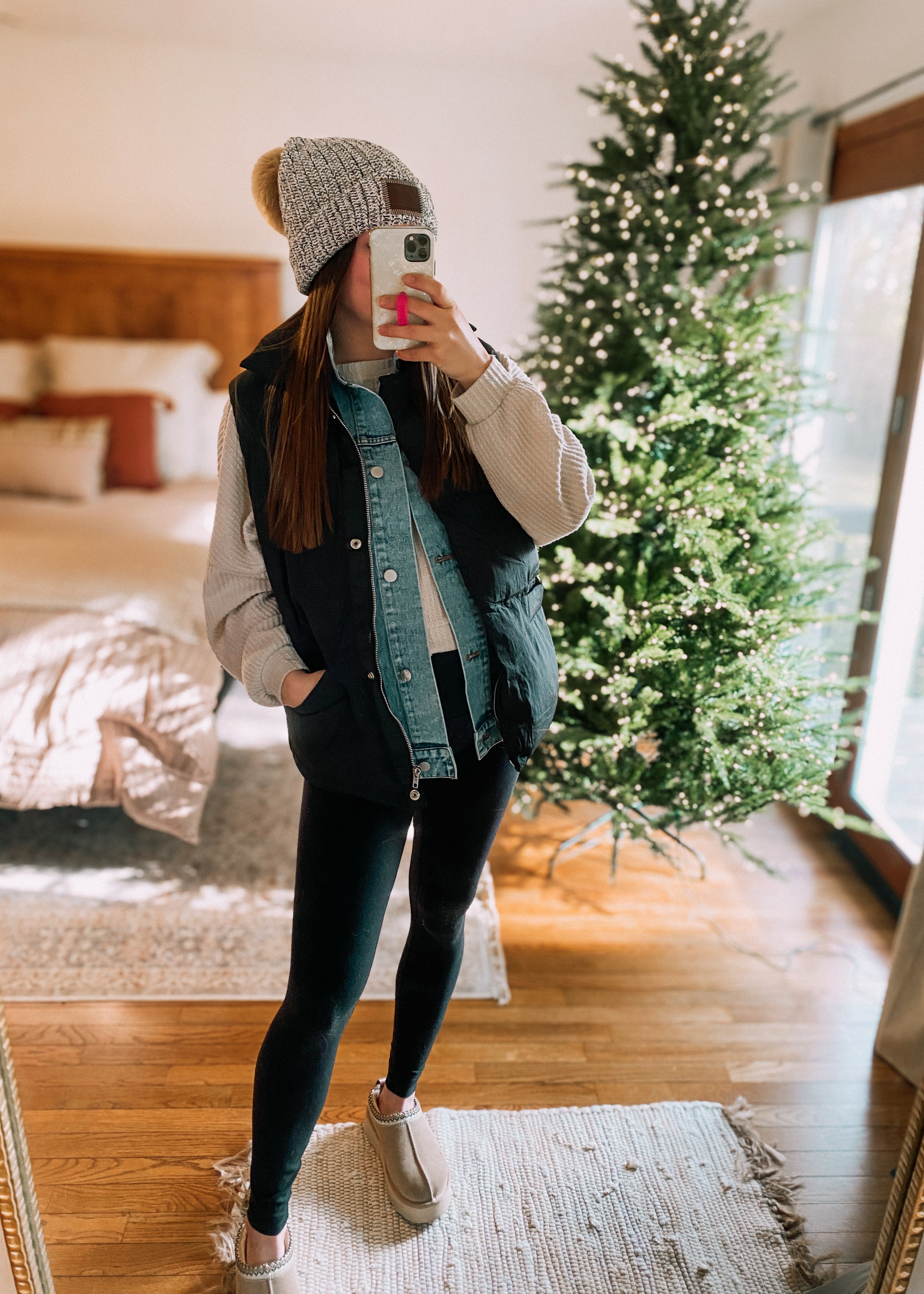 - Black puffer vest with denim color and denim front